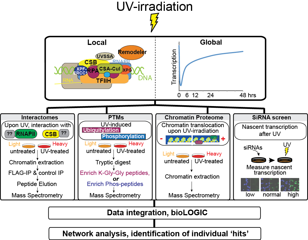 UV-induced DNA damage has effects both at the local (‘repairosome’) and the global level. The proteomic screens and the siRNA screen used to investigate the damage response are outlined. 30 J/m2 UV-irradiation was used for all proteomic analysis, while 15 J/m2 was used in the RNAi screen