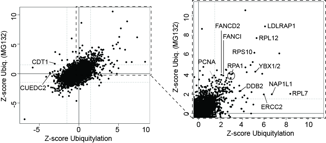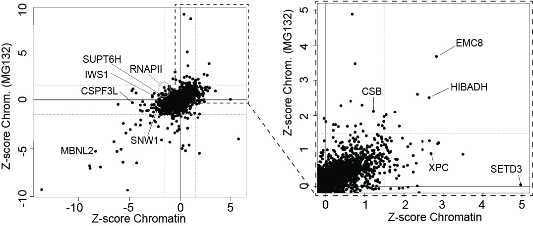 Left, the effect of UV-irradiation on the chromatin proteome in the presence and absence of MG132, as indicated. Right, enlargement of section indicated by box on the left. A few proteins are indicated.