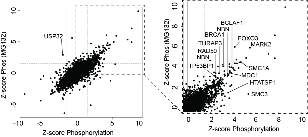 Left, the effect of UV-irradiation on phosphorylation in the presence and absence of MG132, as indicated. Right, enlargement of section indicated by box on the left. A few proteins are indicated.