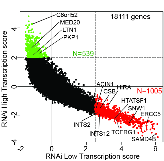 Bottom: Graphical representation of the screen result. High transcribers are labeled green, and low transcribers are red. Specific genes are indicated. Other proteins can be searched at http://www.biologic-db.org.