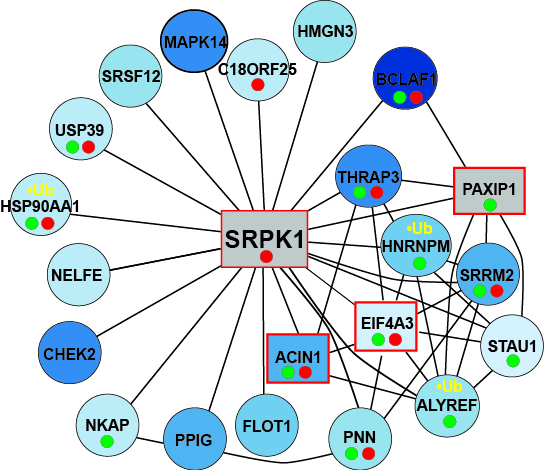 Right Panel: As in the right panel, but for proteins that interact with SRPK1.