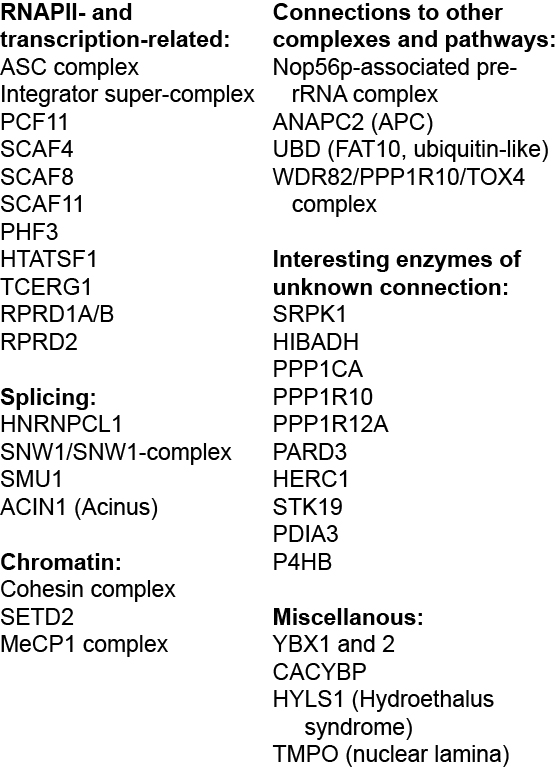 increasing phosphorylation. Proteins that scored in the RNAi screen, (squares with red border), interacted with RNAPII (small green spheres under name),