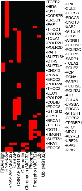 RNA polymerase II (RNAPII) was immunoprecipitaed from chromatin fractions prepared from untreated and UV-treated cells, respectively. Due to the rapid RNAPII degradation of RNAPII upon UV-irradiation, the proteasome inhibitor MG132 was present in both situations. After peptide elution, the eluates were mixed in